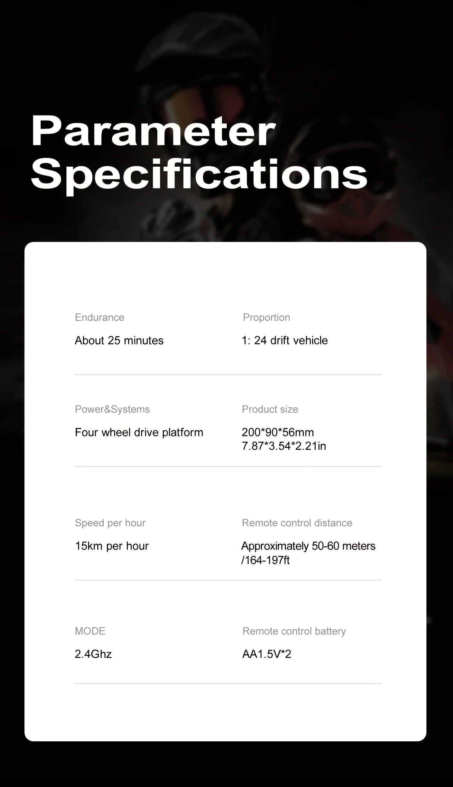 • 1:24 scale, 4WD drivetrain for better traction.